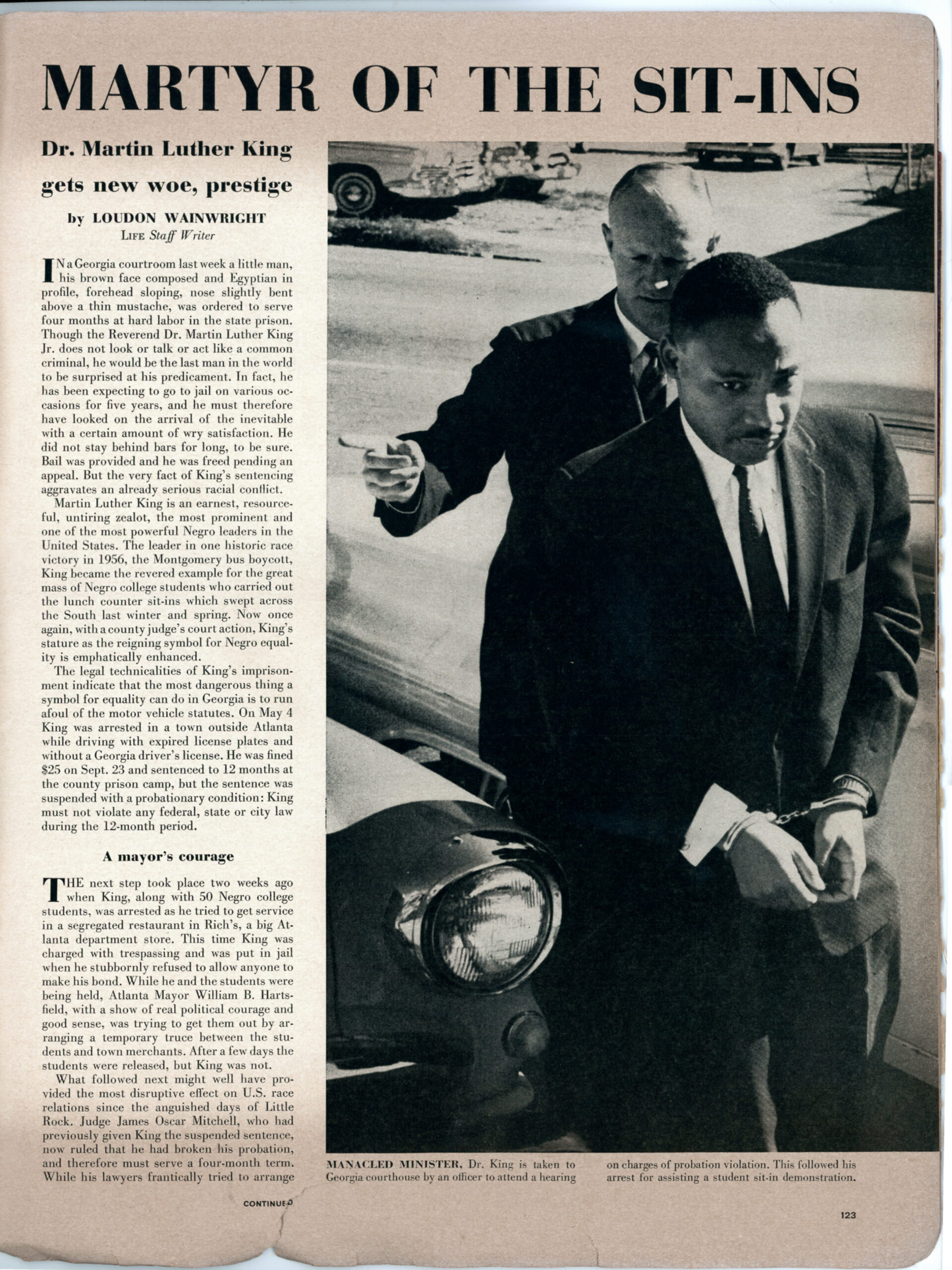 Article about Martin Luther King Jr, from Life magazine published November 7th 1960. Page 1 of 7, featuring a photo of MLK in handcuffs.