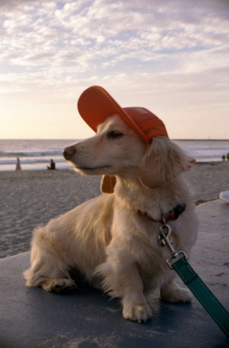 golden retriever sitting on wall at Ocean Beach pier San Diego looking toward ocean, Yashica Electro 35