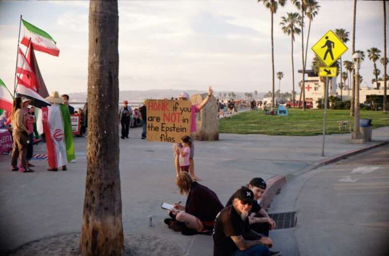 protest group with Palestinian and Iranian flags at Ocean Beach San Diego pier, Yashica Electro 35