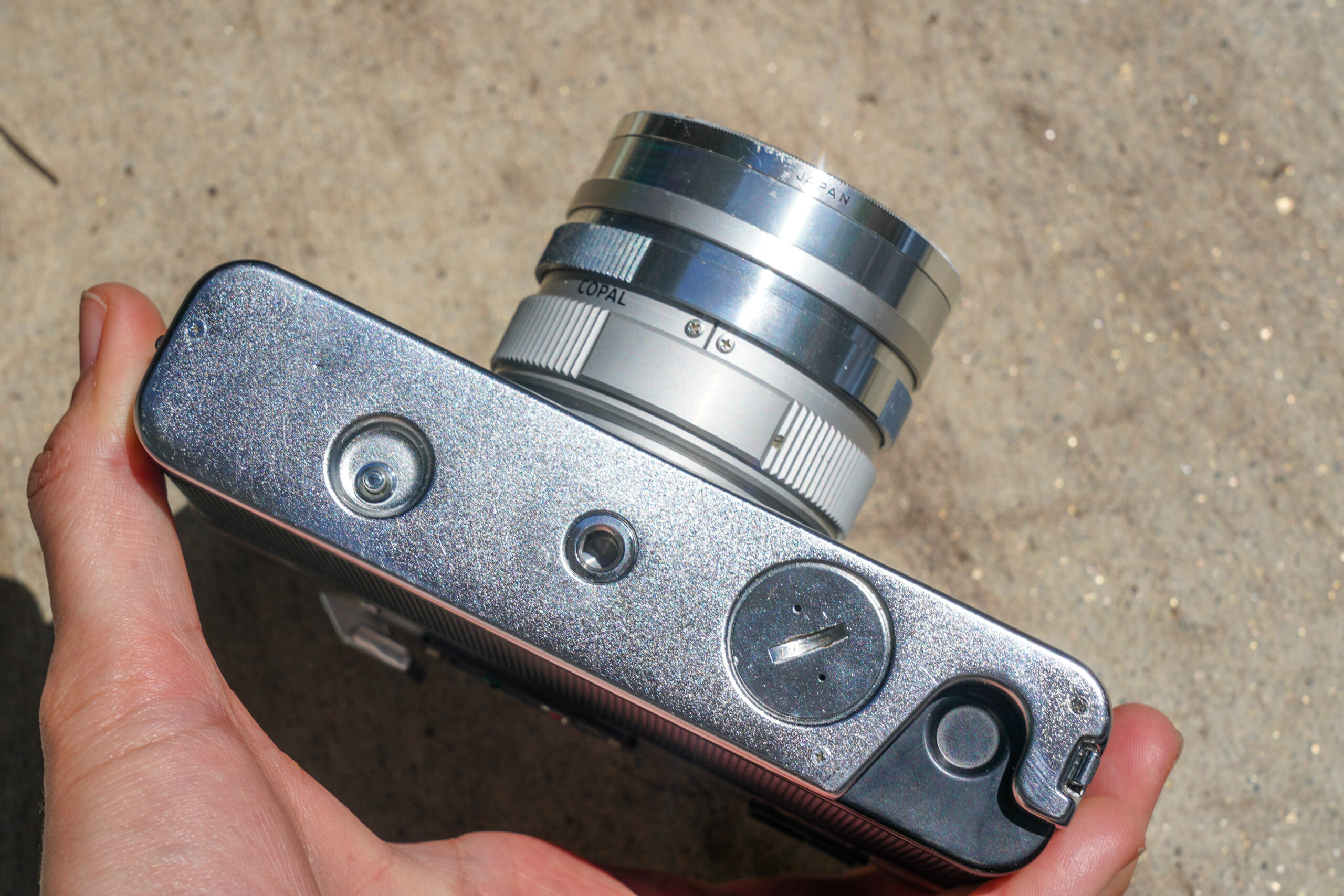 This is a rangefinder camera, which works differently from the reflex cameras that were popular at the same time. With a reflex camera you look through the actual lens via a mirror. With a rangefinder there’s no mirror, no looking through the lens. Instead, you focus by watching a small double image in the center of the viewfinder, called the rangefinder patch, and turning the focus ring until the two images line up into one sharp image. That’s your focus point.